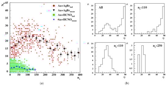 To understand the features of this distribution, Figure 2b shows the distribution of the charge of multi-charge fragments for Au + AgBr with one multi-charged fragment for different regions of ns. The total distribution (Figure 2b—All) is characterized by two distinct peaks. The first peak is formed by events with ns < 110, the second one by events with ns > 110. Peripheral events of different degrees of peripherality characterize the peak in the region of large Q values. The peak at Q < 55 refers to central events and characterizes interactions with different degrees of centrality.