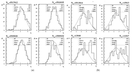 In the events shown in Figure 4b in addition to the “standard” group of particles emitted with pseudo-rapidity η ~ 2.35, a significant part of particles have η ~ 4. Moreover, in some events, for example, Nev = 5,513,014 and Nev = 11,017, the distribution looks like as a two-humped distribution.