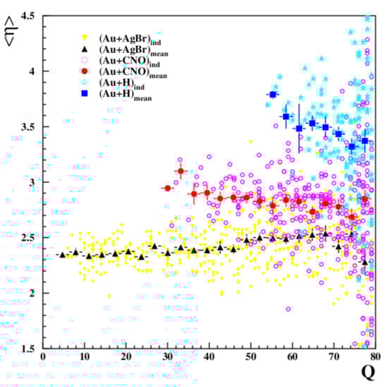 Thus, it can be stated that as a result of the interaction of gold nuclei with the nuclei of the NIKFI BR-2 emulsion in some “anomalous” events, two streams of secondary particles are formed with significantly different pseudo-rapidity. To understand whether these “anomalous” events are interactions of gold nuclei with heavy or light emulsion nuclei, we analyzed the correlations between the values of the pseudorapidity distribution of s-particles and the total charge of the projectile nucleus. The analysis results are shown in Figure 5. As can be seen from Figure 5 the average value of the pseudo-rapidity distribution of shower particles for the interactions of gold nuclei with CNO nuclei in the region <η> ~ 2.85. The average value of the pseudo-rapidity distribution of shower particles for interactions of gold nuclei with heavy AgBr nuclei is located in the region <η> ~ 2.35. It should be noted that for the central Au + CNO interactions of a higher degree of centrality, which are characterized by a lower value of the total charge of the residual fragments of the projectile nucleus, higher values of the average pseudo-rapidity are observed. In Au + AgBr interactions, the opposite effect is observed: with an increase in the degree of centrality (that is, for interactions with a lower Q value) of the interaction, the average pseudo-rapidity decreases.