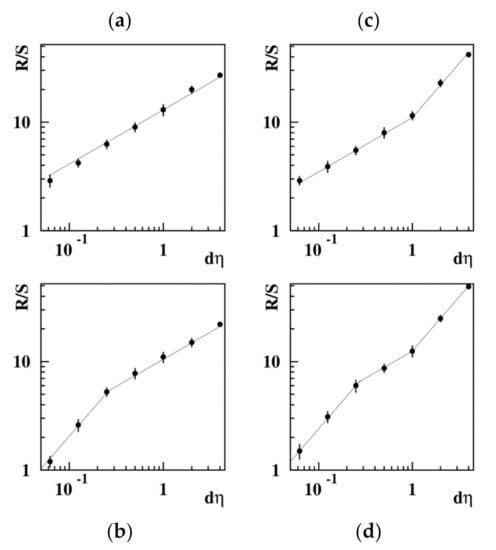 Further, using Formulas (1)–(5), we calculated the normalized range corresponding to the length of the pseudo-rapidity interval dη = 4. After that, the sequence ξi was split in half into two sequences. In each of these sequences, the normalized range was calculated using Formulas (1)–(5). The value of the normalized range for these two parts was averaged and, thus, the normalized range corresponding to the length of the pseudo-rapidity interval dη = 2 was calculated. This procedure of dividing the pseudo-rapidity interval and calculating the normalized range continued until the number of sub-intervals became less than 16, since the number of members of the analyzed sequence should be >>1. The obtained values of the normalized range R/S, depending on the length of the pseudo-rapidity interval dη were fitted using function (6) to find the value of the Hurst index.
