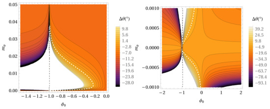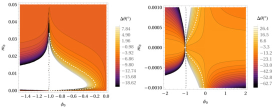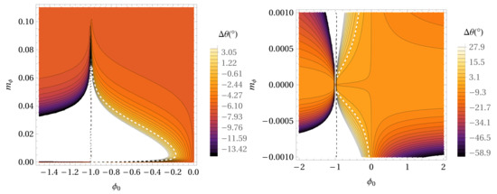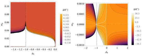 Figure 3. The precession per orbital period for the ϕ 0 - m ϕ parameter space in the case of the Hybrid Palatini gravity potential without extended mass distribution in the case of the S38 star. With a decreasing value of the precession angle, the colors are darker. Parameter m ϕ is expressed in AU 1 . The white dashed line depicts the locations in the parameter space where the precession angle has the same value as in GR (0°.11). The right panel represents the same as the left panel but for smaller values of the m ϕ parameter.