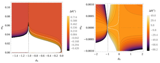 Figure 3 shows the precession per orbital period for the ϕ 0 - m ϕ parameter space in the case of the Hybrid Palatini gravity potential without extended mass distribution in the case of the S38 star. The white dashed line depicts the locations in the parameter space where the precession angle has the same value as in GR for the S38 star (0°.11). The maximal value for m ϕ is about 0.06 AU 1 , and for m ϕ near 0.005 AU 1 , a maximal value for ϕ 0 is obtained, and it is around −0.01. According to the right panel, we can see that m ϕ can also take negative values. Figure 4 represent sthe same as Figure 3 but for the mass density distribution ρ 0 = 4 × 10 8 M pc 3 . The maximal value for m ϕ is less than 0.04 AU 1 , and for m ϕ near 0.005 AU 1 , a maximal value for ϕ 0 is obtained, and it is less than −0.2.