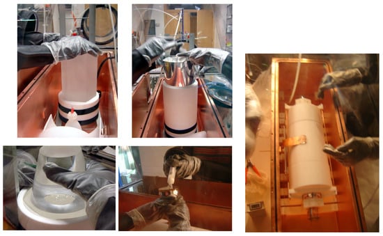 The large expertise acquired by the group using NaI(Tl) scintillators and other techniques applied to the searches for DM pushed forward a new project—ANAIS (Annual modulation with NaI Scintillators). The rationale behind the ANAIS proposal was the positive result of annual modulation of the DAMA experiment [,], a few years after DM32 experiment closed operation, which has been puzzling the field for more than twenty years since then, accumulating statistical significance in its observation up to the present [,,]. A model-independent comparison with the DAMA/LIBRA result was, from the beginning, the goal of the ANAIS project. For that goal, using the same target was mandatory, together with a different experimental approach in order to understand possible systematics. The DM32 experiment concluded that most of the observed radioactive background at low energy could be attributed to Pb and K in materials close to the crystals or in the crystals themselves. Then, the first ANAIS prototypes [,,] tried to improve the background by reducing those contributions: replacing the PMTs and the original steel housing of the NaI(Tl) modules, made by BICRON, by more radiopure PMTs and housing. In parallel, the reduction of the energy threshold was targeted by implementing a pulse-shape discrimination procedure to distinguish PMT-origin events from NaI-scintillation events, and the design of a readout by two PMTs per module. A full program of detector upgrading, building three prototypes and carrying out measurements of the corresponding radioactive backgrounds at LSC’s Lab 3 allowed us to reduce the background and threshold, but confirmed that the dominant contamination was present in the crystal, showing that an experiment using the available 150 kg NaI(Tl) was not feasible. New radiopure crystal providers had to be searched for (see below). On the other hand, the effect of light guides on the light collection and a better understanding of the light propagation and optical properties of the system was achieved using those prototypes, which allowed the group to gain expertise in the design of good-performing scintillating modules. Figure 4 shows several steps of the procedure developed to couple a NaI(Tl) crystal to the light guides and the PMTs inside a Teflon housing, everything enclosed in a tight copper box to prevent humidity from harming the crystal (Prototype-II).