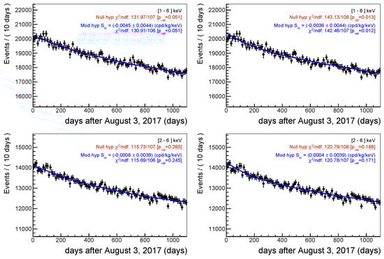 Upper panels: fit results for three years of data in the [1–6] keV energy region in the modulation (blue) and null hypothesis (red) when the background is described by approach (1) (left panel) or approach (2) (right panel). Lower panels: same, but for data in the [2–6] keV energy region.