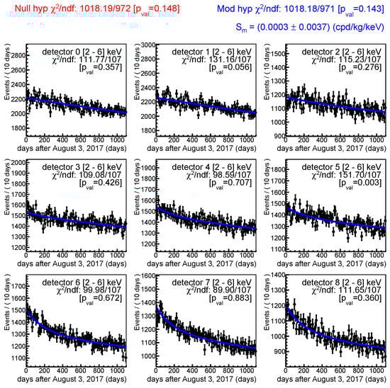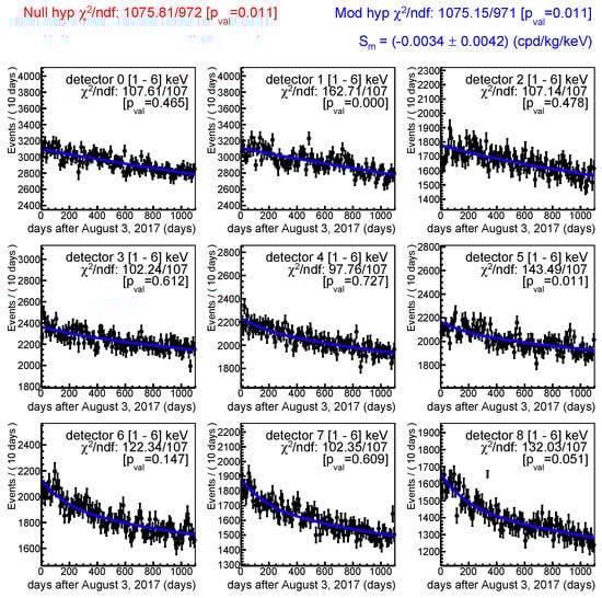 We considered two different approaches to model the experimental background: (1) following [,], the background evolution is approximated to an exponential decay: , where f and  are free parameters; (2) following our Monte Carlo background model [] the background evolution in time is computed and converted into a PDF, so . Finally, (3) we considered the nine modules independently, in order to account for systematic effects that could stem from the different backgrounds and efficiencies among detectors. In this third approach, the  summation was also performed over detectors and the expected number of events for every time bin  and detector d is written as: