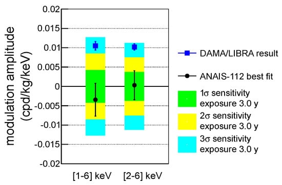 For the modulation hypothesis, the best fit modulation amplitudes are in all cases compatible with zero at 1. The standard deviation  is the same for (1) and (2) approaches and slightly lower for the third approach, when detectors are considered independently, as expected following our a priori sensitivity analysis []. Therefore, this is the standard deviation chosen to quote the ANAIS-112 annual modulation final result for three years. Figure 9 shows a graphical representation of our best fits (black dots) and sensitivity (colored bands) in comparison with the DAMA/LIBRA results (blue squares).