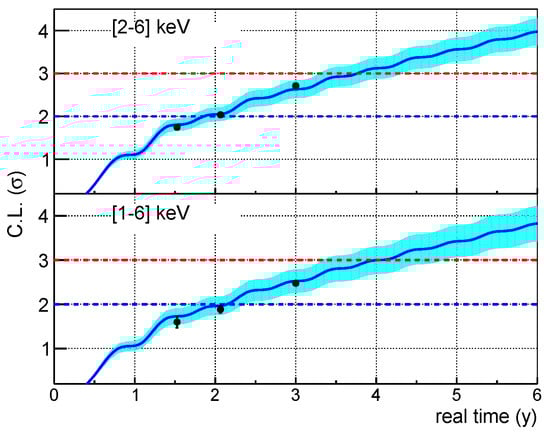 In [] we presented a method to calculate the expected sensitivity to the annual modulation signal according to the measured background, its time evolution and the detector efficiency and live time. Following this method, we have calculated the ANAIS-112 sensitivity projection as a function of the real time starting from 3 August (see Figure 10). The sensitivity is given by the ratio , which provides, in  units, the C.L. at which we can test the DAMA/LIBRA result. For three-year exposure, the ANAIS-112 result  cpd/kg/keV for [1–6] keV ([2–6] keV) corresponds to 2.5 (2.7) sensitivity.