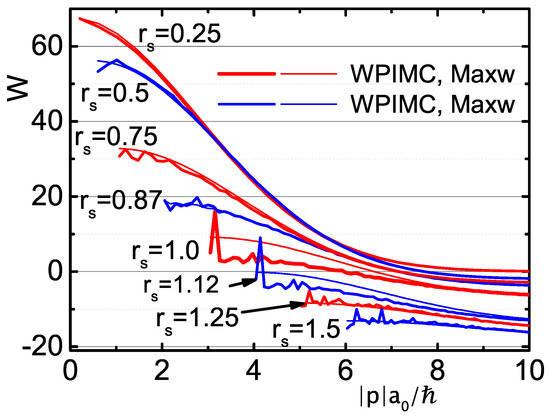 Let us stress that for a fixed with increasing density, the physical temperature increases and the MDF is approaching the Maxwell distribution (MD) (line , ∼). Moreover, at large momentum in asymptotic regions the WPIMC MDF and Maxwell momentum distributions practically coincide. At smaller momentum and intermediate density the WPIMC MDFs show two types of peaks disturbing the Maxwell momentum distribution function: small irregular peaks characterizing the statistical error of WPIMC calculations and the narrow high individual peaks, whose physical meaning must be analyzed.