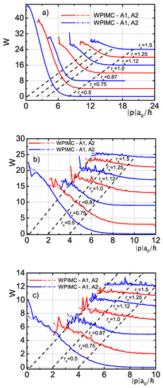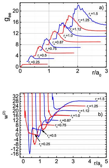 Figure 2a presents the WPIMC calculations of the electron–electron PDFs, while Figure 2b shows the corresponding PMFs in atomic units. As previously, for convenient comparison the origins of the distributions and PMFs are shifted along both axes. With increasing density for a fixed , the characteristic PDF height becomes smaller while the PDF width becomes narrower. Respectively, the depth of the PMF is increasing while the width of the PMF is decreasing. Peaks in PDFs can be associated with the exchange-correlation excitons [11,12] arising due to the occurrence of the exchange positively charged hole and the excluded volume effect [29]. This effect is a consequence of the interference effects of Coulomb and exchange interactions of electrons.