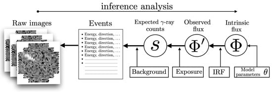 The typical workflow of an IACTs analysis is schematically shown in Figure 1, where, starting from the shower images, the variable s (the expected number of signal events) is derived, which is then used for inferring the flux of gamma rays by taking into account the instrument response function (IRF) of the telescopes.