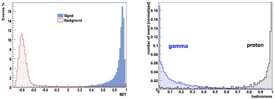 A detailed review and comparison of different multivariate methods for event classification in IACTs can be found in Ref. [27]. In this section, we provide a brief description of the currently most used methods, the Boosted Decision Tree (BDT) and the Random Forest (RF) [28]. The BDT approach, implemented for the HESS [29,30] and VERITAS [31] telescopes, is a binary tree where events are sorted into small subsets by applying a series of cuts until a given condition is fulfilled. This condition might be given by requiring that the number of events in a leaf is smaller than a predefined value or that the signal over the background ratio in a leaf must be large enough. The term “boosted” refers to the fact that more than one individual decision trees are combined in a single classifier by performing a weighted average. The boosting allows improving the stability of the technique with respect to fluctuations in the training sample and is able to considerably enhance the performance of the gamma/hadron separation compared to a single decision tree. Like the BDT approach, the RF method, implemented for the MAGIC telescopes [32], also relies on decision trees, which are built up and combined with some elements of random choice. As for the BDT, training samples of the two classes of population (signal and background) are needed for constructing the decision trees. Once the classifier has been properly8 trained, the algorithm can be used to assign to each event a single discriminating variable whose distribution on a test gamma and hadron population can be seen in Figure 3.