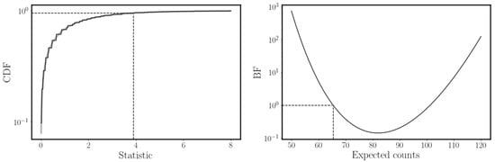 The evolution of the BF as a function of the expected counts , using (which is our hypothesis of interest) and the experiment result is shown in the right panel of Figure 4. It is worth noticing that the BF is connected to the statistic in Equation (15) via