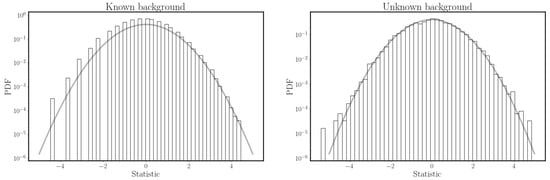 Distribution of the Cash statistic in Equation (24) (left panel) and the Li&Ma statistic in Equation (28) (right panel) from measurements in which the background is known precisely to be or must be estimated from the OFF counts with , respectively. In both simulations, the true values of s and b are 0 and 10, respectively. In both plots, the PDF of a normal distribution with mean zero and variance 1 is shown in grey as reference. In both cases simulations were performed. The distribution in the left panel looks to be less populated due to the fact that having the background fixed to 10 (and not estimated from an OFF measurement) limits the number of possible outcomes of the statistic.