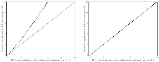 Comparison between the Li&Ma statistic in Equation (28) (x-axis) and the Cash statistic in Equation (24) (y-axis). In both plots, each point shows the significance for a different ranging from 10 (where the significance is zero in both cases) to 56. For the Cash formula is fixed to 10 in both plots, while for the Li&Ma formula is 10 with in the left plot, and with in the right plot. As a reference the equation (dashed line) is shown. One can see that the Li&Ma statistic converges to the Cash one when .