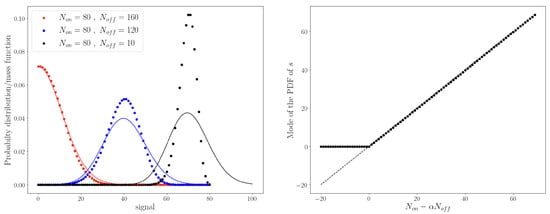 where is a bound variable whose physical meaning will be clear soon. Thus, the PDF of the expected signal counts s is given by a weighted sum of Poisson distributions with observed counts ranging from 0 to . One can recognize (see Refs. [58,59] for a detailed explanation) in Equation (34) a marginalization over the variable . The weights in the sum of Equation (34) are indeed the PMF of the number of signal events in the ON region: