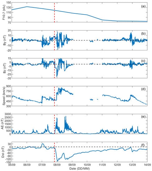 Solar radiation, and interplanetary and geomagnetic parameters, for the period of 05–13 September 2017: (a) F10.7 index, (b) IMF By, (c) IMF Bz, (d) solar wind speed, (e) AE index, and (f) Dst index. A geomagnetic storm commenced at 20 UT on September 7, 2017. The red vertical dotted line in each panel indicates the first main phase onset time of this storm, and the black horizontal dashed lines in (b,c,f) mark the zero values for By, Bz, and Dst, respectively.