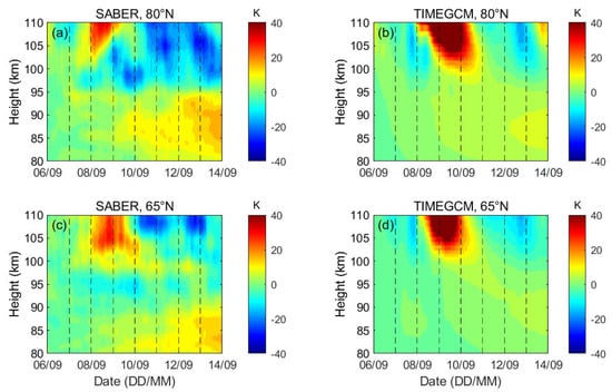Figure 2 presents the variations of temperature in SABER data and TIMEGCM outputs on 6–13 September 2017 for the 5° bins centered at 80° N and 65° N. The use of different ranges of color bars is not conducive to our comparison and analysis. Thus, the same range of color bars was used for all figures. If the range of color bars is relatively large, such as -90 K to 90 K, the temperature variations observed by SABER would be difficult to reflect, especially at low and middle latitudes. Combining various factors, we used a color bar range of -40 K to 40 K. During this severe geomagnetic storm, the peak of the SABER temperature increase was greater than ~35 K above 100 km at 80° N (Figure 2a) and larger than ~30 K above 98 km at 65° N (Figure 2c). The storm effects on high latitudes in the northern hemisphere lasted for ~three days (7–9 September). The increase commenced before the storm onset as clearly shown in Figure 2a,c, which might be due to the small geomagnetic disturbances at that time. Conversely, the peak of the TIMEGCM temperature enhancement was ~90 K above 98 km at 80° N (Figure 2b), and ~75 K above 100 km at 65° N (Figure 2d). Both at 80° N and 65° N, the peaks of TIMEGCM temperature increase were more than twice that of SABER temperature. The storm effects on the TIMEGCM temperature continued from 8 September to 10 September. In both SABER observations and TIMEGCM simulations, there was a temperature decrease followed by an increase. The temperature decrease was stronger and lasted longer in SABER data and the decrease of 80° N was larger than that of 65° N in both observations and simulations. The SABER observations showed that, at 65° N, the temperature decrease can be observed at ~103 km, while at 80° N, the temperature decrease appeared at lower altitudes around 96 km. Conversely, the TIMEGCM temperature decrease penetrated down to ~98 km at both 80° N and 65° N. Furthermore, a noticeable characteristic is that the 5–20 K temperature increases below 95 km in SABER data and TIMEGCM outputs occurred almost simultaneously with the temperature decrease above 95 km.