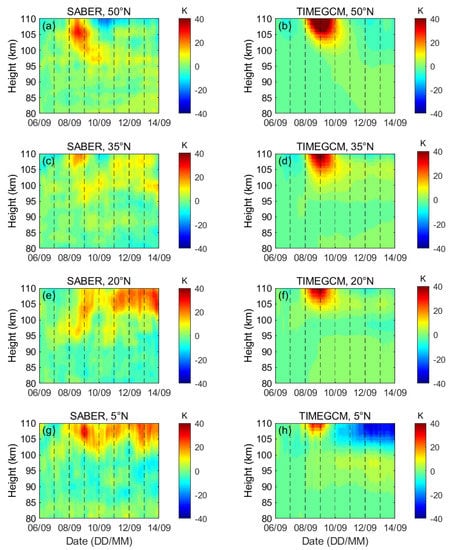 Figure 3 provides our results in SABER data (left column) and TIMEGCM outputs (right column) as a function of altitude from 80 km to 110 km at 50° N, 35° N, 20° N, and 5° N. During the severe geomagnetic storm, the peak of SABER temperature increase (the left column of Figure 3) was larger than 30 K above ~96 km at 50° N (Figure 3a), and the storm responses continued for ~two days. Moreover, at 50° N, there was a weak temperature decrease (~20 K) above ~107 km lasting for only ~one day, which followed the temperature increase. At 35° N (Figure 3c), the peak temperature enhancement was relatively weak, which was about 20 K above 105 km and lasted for ~one and a half days. At lower latitudes (5° N and 20° N, Figure 3e,g), the temperature increases induced by the storm extended down to ~100 km, with a peak of ~30 K. Of note is that the storm effects on the temperature lasted for ~six days.
