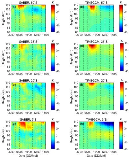 Analysis of the geomagnetic storm responses on fixed latitude levels at 50° S, 35° S, 20° S, and 5° S is shown in Figure 4. From late 7 September to early 9 September, although SABER temperature increases had similar manners over the range of 50° S–20° S (Figure 4a,c,e), their peaks decreased from ~30 K to ~20 K with decreasing latitudes and the peaks always appeared on 8 September. The storm-induced temperature increases penetrated down to ~105 km. In TIMEGCM simulations, over the range 50° S–20° S (Figure 4b,d,f), temperature enhancements also had similar patterns during 8–9 September. The peaks were larger than ~45 K, and the maximum occurred at 35° S. These storms influence transmitted downward to ~103 km. In addition, at 50° S, both SABER and TIMEGCM results show the temperature decrease with a peak of ~15 K, which followed the temperature enhancements. However, the height of the temperature decrease in the model outputs was ~5 km higher than in the SABER observation, and its duration was longer than the observed temperature decrease. Moreover, the temperature decrease was found again at 20° S in the SABER results, and the peak value of the temperature decrease was about 15 K. However, there was no obvious temperature decrease in the variations of TIMEGCM simulations. The other noticeable result from Figure 4 was a great divergence of the temperature variations between the model outputs and the SABER data at lower latitudes in the southern hemisphere (Figure 4g,h). For instance, during this geomagnetic storm, the SABER temperature changed with a peak of ~30 K above 102 km at 5° S, and the storm effects lasted for ~three days. However, TIMEGCM failed to capture the temperature increase occurring in SABER at 5° S. Specifically, the TIMEGCM temperature enhancement continued only ~one day with a peak larger than 25 K above ~104 km. A salient aspect at 5° S was a temperature decrease with a peak of ~40 K lasting more than four days that followed the TIMEGCM temperature enhancement, and the effects of the temperature decrease propagated down to ~103 km.