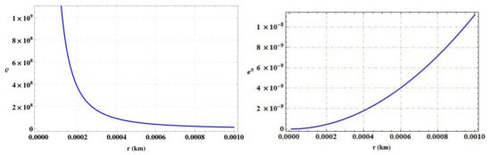 The positive values of matter variables (density and pressure) provide positive value of . For real value of this parameter, the suitable constraints are and . Furthermore, binomial series is used to expand the square-root entities of Equation (34) along with the constraints , , and taking only the first-order terms, we can obtain: