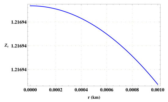 The plot of surface redshift (by inserting the numerical values of constants A and B) is shown in Figure 4, which indicates that the value of the redshift parameter does not exceed the bound 2 within the shell of gravastar. Thus, the obtained solutions of gravastar structure are physically consistent and stable.