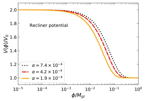 - The Recliner potential []:where and are constant. The Recliner model is characterised by tracker solutions [] and as such it belongs to a class of models known as -attractors [,]. They have been proposed to study inflation and have the interesting feature of linking inflation and the present dark-energy dominated era.