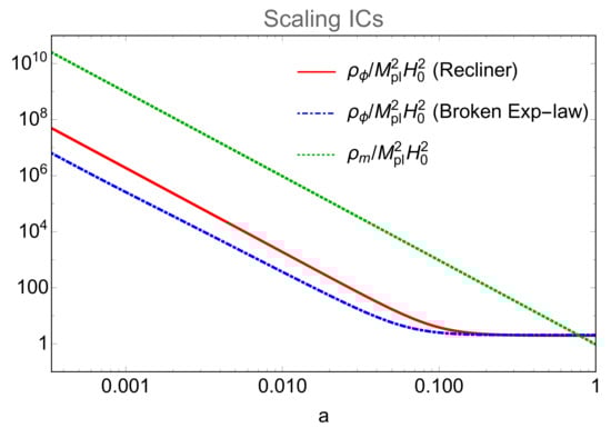 Other working examples can be realised by considering the transition . In this case we can use for the ICs the values of , corresponding to the critical point . In the case of the Recliner potential we can use and an arbitrary value for , which we chose to be . The other two ICs are selected such that as for the previous cases: and . The latter is the parameter which mostly affects the present day value of , . The chosen value allows to have , large values of move it to . These ICs allow the trajectories to start on the critical point and to closely approach . We found that the values of s do not have any significant impact on the evolution of the matter and scalar field densities for this case. We also ensure that under this condition the matter era is long enough, with a transition to the scalar field dominated era to be at . Let us now consider the case of the broken exponential-law potential. The ICs for the transition between and can be chosen as in the previous case, because they share the same coordinates. For this case we fix , , . Then we consider for the configuration for which and . For we checked that changing its value of several orders of magnitude () will barely change the general behaviour of the system. However, trajectories closely approach for the smaller value. For completeness, we select the ICs for (to be slightly adjusted depending on in order to have ) and . The transition between the matter domination and the scalar field domination happens around .
