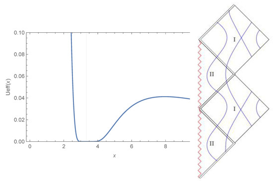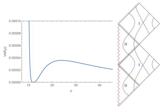 and since , the singularity is located at . Therefore, in this case, the singularity is bounded by two event horizons, one at and another one at , where both surfaces have an infinite area, , and it is Minkowski at . Hence, we have three regions, called III, II, and I, respectively: , , and . The signature is for Regions I and III, while it is for Region II. The causal structure is similar to a non-extreme RN solution. In Figure 1, we plot the effective potential of the geodesics equation and the Carter–Penrose diagram (CPD) for this case.