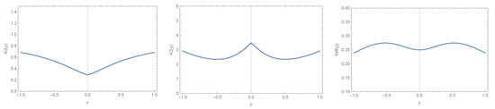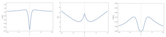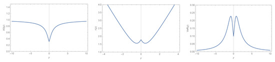 Figure 5. Plot of the function , the radius , and the effective potential, respectively, for the second WH solution, Equation (89). The values used for the parameters in this plot were: , , , and . - At the throat, , the radius is:The effective potential in this case also allows photon spheres, as we can see in Figure 6. The metric in this case also becomes the Ellis wormhole [22] for .