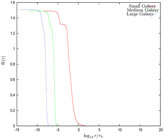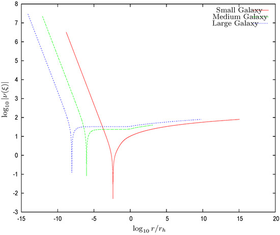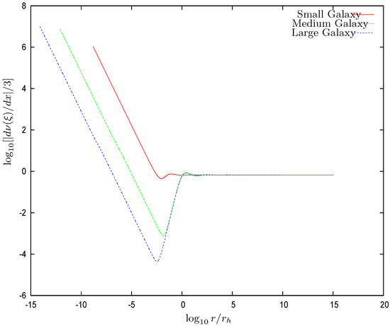 Figure 2. The derivative of the dimensionless chemical potential vs. for the three galaxy solutions with central SMBHs defined by Equation (74). For , both and follow the behavior dictated by the central black hole. is the influence radius of the BH defined by Equation (31). For and , they are dominated by WDM and exhibit a similar behavior to that for the Thomas–Fermi galaxy solutions without a central black hole [9,10,11,12].Figure 3 shows that the local density behavior is dominated by the black hole for . For , the WDM gravitational field dominates over the black hole field, and the galaxy core shows up. For medium and large galaxies, the core is seen as a plateau. At the same time, the chemical potential is negative for , and the WDM is a classical Boltzmann gas in this region.