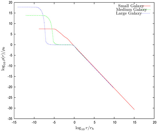 Figure 3. The density normalized at the influence radius , vs. for the three galaxy solutions with central SMBHs. Notice that in the quantum gas WDM region , the density is constant clearly exhibiting a plateau behavior corresponding to the quantum Fermi gas behavior in such a region.The surface densityhas the remarkable property of being nearly constant and independent of luminosity in different galactic systems (spirals, dwarfs irregular and spheroidal, and ellipticals) spanning over 14 magnitudes in luminosity and over different Hubble types [36,37]. It is therefore a useful physical characteristic scale in terms of which galaxy magnitudes are expressed. - (iii)