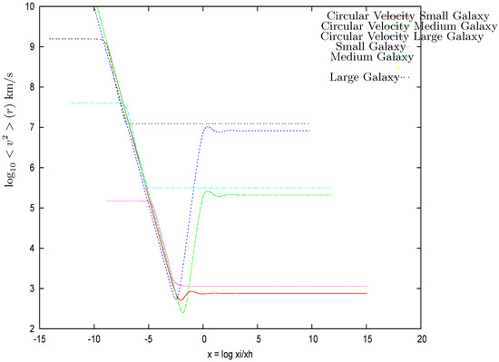 - We find that scales as , which is the same scaling found in the Thomas–Fermi approach to galaxies in the absence of black holes [9,10,12]. We plot in Figure 10 the ordinary logarithm of the halo radius vs. the ordinary logarithm of the halo mass for galaxies with central black holes of many different masses. The halo mass in the absence of a central black hole behaves in the Thomas–Fermi approach as [12]