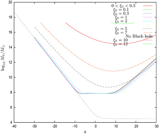 Figure 6. The halo mass vs. the constant A of the chemical potential behavior at the origin for fixed values of . The halo mass increases with at fixed A. increases when the absolute value of A increases at fixed . In the absence of the central black hole, the halo mass monotonically decreases when A increases until reaches its minimal value, Equation (82) at the degenerate quantum limit at zero temperature [9,10,12]. In the presence of a central black hole, we find a larger minimal value for the halo mass Equation (83) with a non zero minimal temperature Equation (84). Therefore, there is an important qualitative difference between galaxy solutions with a black hole , and galaxy solutions without a black hole .The mass of the supermassive black hole monotonically increases with the central radius or equivalently the dimensionless one at fixed A. In addition, for , that is, for small supermassive black holes, and all A, the galaxy parameters, such as halo mass , halo radius , virial mass and galaxy temperature , become independent of , showing a limiting galaxy solution. Only the BH mass depends on in this regime.Figure 7displays our results for . Figure 8 displays our results for the black hole mass vs. the halo mass . We see that is a two-valued function of . For each value of , there are two possible values for , which are quite close to each other. This two-valued dependence on is a direct consequence of the dependence of on A shown in Figure 6. The branch points on the left in Figure 8 correspond to the minimal galactic halo mass Equation (83) when the central supermassive black hole is present. At fixed , as shown in Figure 8, the central black hole mass scales with the halo mass aswhere is an increasing function of . We plot in Figure 9 the halo galaxy mass vs. the galaxy temperature . The halo mass grows when increases. Colder galaxies are smaller. Warmer galaxies are larger. We see at the branch points in Figure 9 the minimal galaxy temperature in Equation (84) when a supermassive black hole is present.