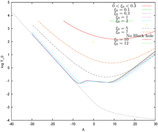 Figure 7. The galaxy temperature vs. the constant A of the chemical potential behavior at the origin, for fixed values of . As for the halo mass , the galaxy temperature increases with at fixed A. increases when the absolute value of A increases at fixed . In the absence of a black hole, the galaxy temperature tends to zero for (at the exact Fermi degenerate state), while in the presence of a central black hole, we find that is always larger than a minimal non-zero value given by Equation (84).
