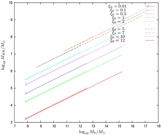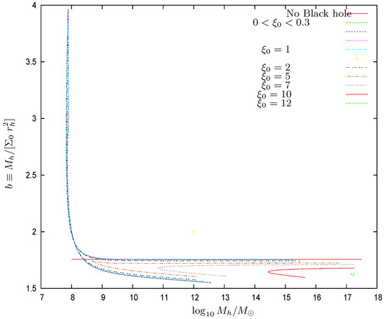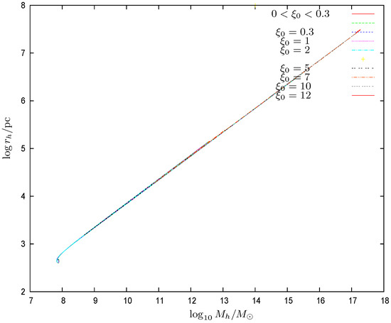 Figure 10. The halo radius vs. the common logarithm of the halo mass for galaxies with supermassive central black holes of many different masses. turns out to be a two-valued function of . We see that accurately scales as . The same scaling was found in the Thomas–Fermi approach for galaxies in the absence of black holes [9,10,12].The proportionality factor in this scaling relation is confirmed by the galaxy data [12]. In the presence of a central black hole, we find in the Thomas–Fermi approach an analogous relationwhere the coefficient b turns to be of order unity. We plot in Figure 11 the coefficient b as a function of the halo mass . We see that, except for halo masses near the minimum halo mass , b in the presence of a central black hole takes values up to 10% below its value in the absence of a central black hole Equation (85). For halo masses near increases, reaching values . For very large halos and central black holes, b could be as small as about . b changes at most by a factor from up to 2 while the halo mass varies by ten orders of magnitude. As shown by Figure 11, b is a two-valued function of . b turns out to be independent of the precise value of the WDM particle mass m, which is due to the fact that the scaling relation Equation (86) as well as Equation (85) apply in the classical Boltzmann regime of the galaxy (). In summary, the scaling relation Equation (86) and the coefficient b turn out to be remarkably robust.