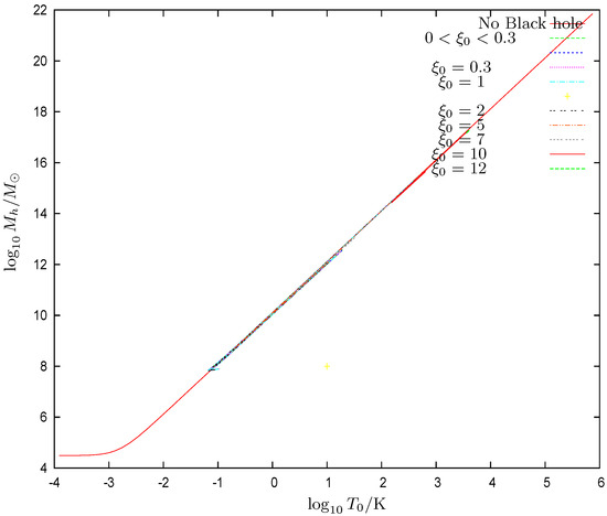 Figure 9. The halo galaxy mass vs. the galaxy temperature . turns to be a two-valued function of . The halo mass grows when increases. Colder galaxies are smaller, while warmer galaxies are larger. We see at the branch points in Figure 9 the minimal galaxy temperature Equation (84) when a supermassive black hole is present.We find galaxy solutions with central black holes for arbitrarily small values of and a correspondingly, arbitrarily small central BH mass. There is no minimal central BH mass. The only minimal central BH mass possibility is zero (for ). - (x)