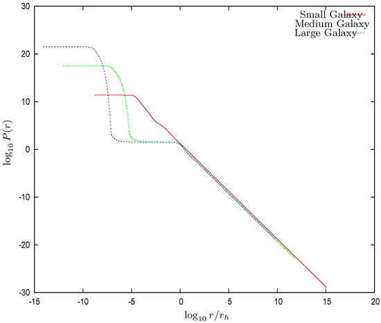 Figure 13. The logarithm of the local pressure vs. for the three galaxy solutions with central SMBH. Notice the huge values of in the quantum (high density) region and its sharp decrease entering the classical (dilute) region .