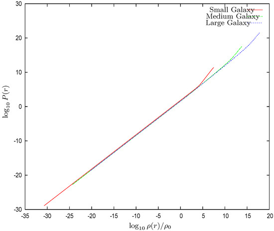 Figure 14. The obtained equation of state of the galaxy plus central SMBH system: the logarithm of the local pressure vs. . In all the cases, we find almost straight lines of unit slope. The equation of state is a perfect gas equation of state in the Boltzmann classical region. In the quantum gas (dense) region, the equation of state becomes steeper than the perfect gas. Galaxies with central black holes are in the dilute Boltzmann regime because their halo masses are , Equation (83). This explains the perfect gas equation of state.