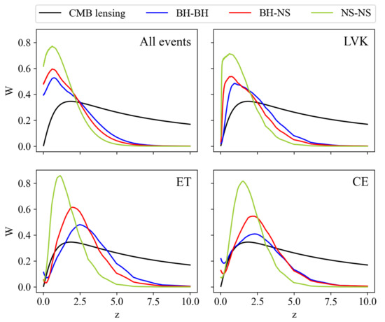 In Figure 1, we compare the CMB lensing kernel with the SGWB kernel for different sources (BH-BH, BH-NS and NS-NS) and detectors, computed using Equations (4) and (8), respectively. The lensing kernel is a broad function of redshift that peaks at and decreases slowly at higher redshifts, making the CMB lensing convergence a powerful probe of LSS up to the last-scattering surface. In the upper-left panel, we consider the SGWB obtained integrating all the GW events, resolved and unresolved. The kernel is quite broad and peaks at 1 for all types of sources. The exact position of the peak and the shape of the kernel are the outcomes of the complex interplay among the behaviour of three factors: the merger rate, the flux carried by each GW event and the SGWB bias. On the one hand, the shape of the redshift distribution reflects the fact that the merger rate peaks with the cosmic star formation rate at and rapidly declines at higher redshifts. On the other hand, nearer events largely contribute to the SGWB energy density because their flux is less diluted. Finally, the SGWB bias is an increasing function of redshift (see upper panels of Figure A2) so that its effect is to give more weight to more distant objects. The BH-BH kernel is slightly broader than BH-NS and NS-NS ones because BH-BH binaries have a greater chirp mass and produce more energetic GW signals, contributing significantly up to higher redshift. The upper-right panel shows the kernels of the residual SGWB, which we obtain filtering out the events individually resolved by LIGO/Virgo/KAGRA. Typically, this operation removes many of the nearby events, especially the energetic BH-BH mergers, conferring a proportional higher weight to more distant ones. For this reason, the kernels are broader and peak at slightly higher redshifts than in the previous case, where we integrated all GW events to obtain the SGWB.