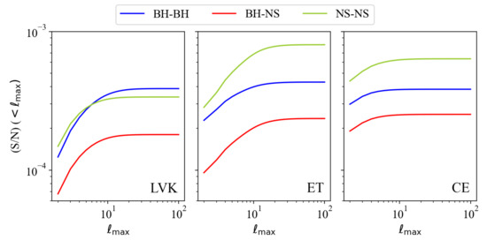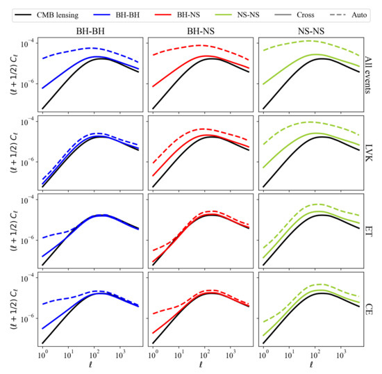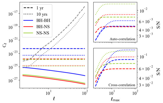 For illustrative purposes, in Figure A3 we show the angular power spectrum of three realizations of the SGWB (one for each type of source) at the reference frequency of 65 Hz, measured by ET during an observation of one year. For comparison, we also plot the theoretical power spectra that represent the correlation of the SGWB anisotropies induced by the LSS: the shot noise outreaches the signal by several orders of magnitude. The shot noise contribution is particularly high in the BH-BH case, because BH-BH mergers have a lower rate with respect to BH-NS and NS-NS ones. Of course, the amplitude of the shot noise is also determined by choice of the integration time T, as . In this work, we adopt a reference values yr and yrs and we estimate the shot noise amplitude averaging over 20 realizations of the SGWB.