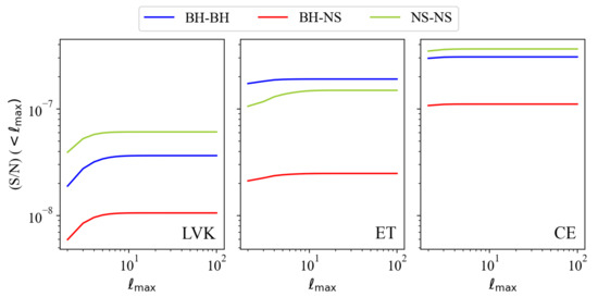 Cumulative S/N as a function of for the SGWB auto-correlation angular power spectrum. The curves have been evaluated summing the Equation (3) from up to .