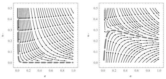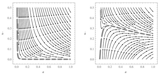 Now, by plotting the phase portrait of Equation (32), the difference between the commutative and noncommutative cases are clearly visible. For the former (see the left panel of Figure 6), for all the solutions , it is seen that always decreases while a increases. Whereas, for the latter (see the right panel of the Figure 6), for very small values of the scale factor, we observe an additional interesting behavior for all the solutions . More concretely, during a very short time, increases until it reaches its maximum value. Thereafter, it decreases while the scale factor increases. Finally, depending on the ICs and the values of the parameters of the model, it gets constant values at late times. It is worth noting that Figure 6 includes a vast range of solutions such that the particular solution shown in Figure 1 corresponds to one of the trajectories plotted in Figure 6. This phase portrait, with more complete specifications, certifies the inflationary phase (with a graceful exit) described in the previous section. We should emphasize that our herein NC model, for various sets of the parameters, can yield the interesting results presented within the preceding section. For instance, the Figure 7 shows the phase portrait of Equation (32) with other values of n, and .
