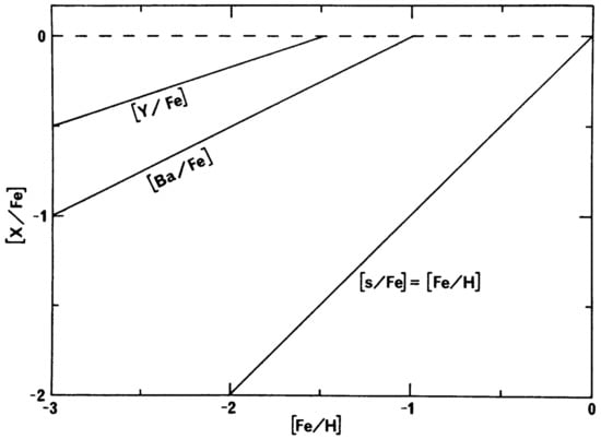 We start with the pioneering results shown by Truran [6]. Although he did not consider a real chemical evolution model, nor a detailed nucleosynthesis of the neutron capture elements, nevertheless, he used fundamental concepts of chemical evolution applied to the knowledge of s-process nucleosynthesis, in particular, the fact that s-process nucleosynthesis is expected to behave as a secondary process. Therefore, as described in the previous section, the secondary production dependent on the abundance of metal seeds (in particular iron) is expected to increase quadratically with iron abundance, and therefore the ratio of the secondary (i.e., s) element relative to the seed (i.e., Fe) should be linear, as shown in Figure 1 for the [s/Fe]1 line. However, it should be noted that such a behaviour for secondary elements is only valid in the framework of the Simple Model of chemical evolution, whose solution, both for primary and secondary elements, is obtained with IRA. Therefore, it is expected that in a realistic situation where the complexities of nucleosynthesis and stellar lifetimes are taken into account, elemental abundances do not follow the predictions of the Simple Model.
