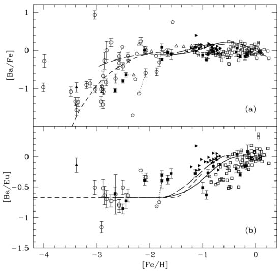 [Ba/Fe] vs. [Fe/H] in panel (a) and [Ba/Eu] vs. [Fe/H] in panel (b). The short-dashed line describes the halo, the long-dashed line shows the thick disk, and the solid line is for the thin disk. Observational data are from Gratton and Sneden [16] (filled squares); Woolf et al. [17] (open squares); Francois [18] (pentagons); McWilliam et al. [19] and et al. [20] (circles); Norris et al. [21] (filled triangles); Jehin et al. [22] (filled tilted triangles); Mashonkina et al. [23] (open triangles). Thin dotted lines connect stars with different abundance determinations. Image reproduced with permission from Travaglio et al. [7]; copyright by the authors.