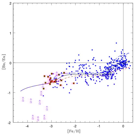[Ba/Eu] vs. [Fe/H]. Data (filled squares) and lower limits (open square) by François et al. [27]; in blue observational data from Burris [28], Fulbright [29], Koch and Edvardsson [30], Honda et al. [31], Mashonkina and Gehren [32,33]. The solid line is the prediction of the best Model 1; the short-dashed line and the long-dashed line are the predictions of max and min models, which are able to include most the observational data for [Ba/Fe] vs. [Fe/H]. Image reproduced with permission from Cescutti et al. [24]; copyright by the authors.