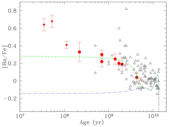 Average [Ba/Fe] as a function of stellar age for the subsample of clusters whose analysis is based on dwarfs (filled circles and inverted triangles) compared with the abundance pattern of disk stars (open triangles) by Bensby et al. [38]. Filled triangles represent abundance measurements that probably need NLTE (non-local thermodynamic equilibrium) corrections (but see [39]). The model results are shown for two set of yields: the standard yields [4,7] with a long-dashed curve; the enhanced s-process yields with a dot-dashed curve. Both models show a peak at old ages due to the r-process from massive stars. Image reproduced with permission from D’Orazi et al. [35]; copyright by the authors.