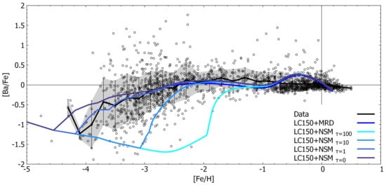 Comparison between observed and predicted [Ba/Fe] ratios vs. [Fe/H]. The black dots, track, and shadowed area are the observations (sources listed in Table 1 of [42]); the dark blue line is the model with magneto-rotationally driven SNe (see [45]) as r-process sources; the lighter blue line is the model with neutron star mergers as r-process sources with variations in the time delay (from darker to lighter), with = 0, 1, 10, and 100 Myr. Image reproduced with permission from Rizzuti et al. [42]; copyright by the authors.