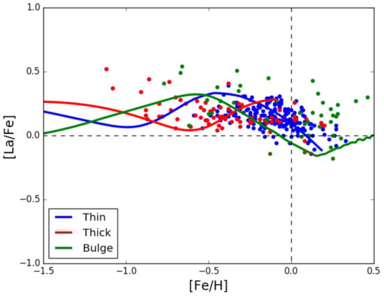 Comparison between observed and predicted [La/Fe] ratios vs. [Fe/H]. The theoretical thick disk is shown by the red curve, the thin disk by the blue one, and the bulge by the green one. The data points for the three components are indicated by the same colours as the theoretical curves. Image reproduced with permission from Grisoni et al. [46]; copyright by the authors.