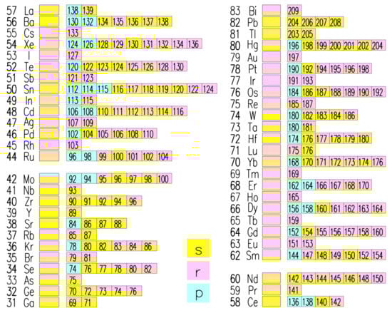 Contributions of the s-, r-, and p- processes to the solar chemical composition. The contribution of each process is proportional to the coloured area of the corresponding box. Image reproduced with permission from Prantzos et al. [49]; copyright by the authors.