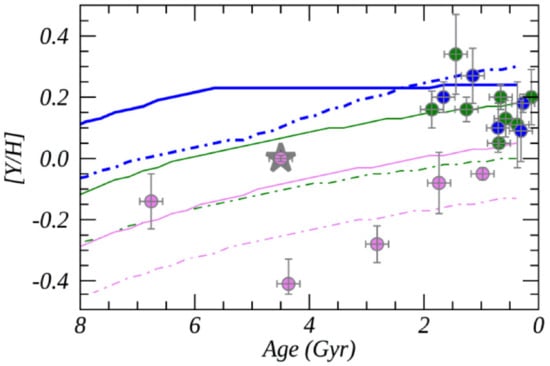 [Y/H] vs. age; sample of Gaia-ESO idr5 clusters in three radial bins (Galactocentric radius (RGC) < 6.5 kpc in blue, 6.5 kpc < RGC < 9 kpc in green, and RGC > 9 kpc in pink), compared with results of the GCE model for the thin disk at three RGC = 6, 8, and 10 kpc, with the yields computed with AGB models adopting mixing triggered by magnetic fields (continuous curves) and those with the FRUITY yields (dot-dashed lines). The star marks the abundance ratio at the solar age and the Galactocentric distance. Image reproduced with permission from Magrini et al. [52]; copyright by the authors.